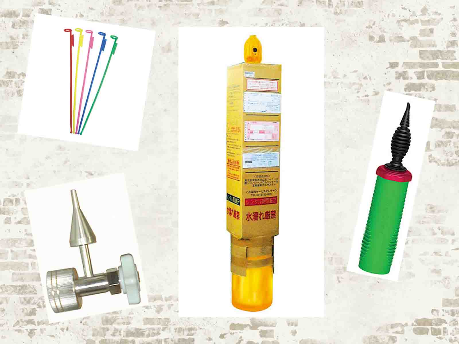 膨らませるためのヘリウムガスやハンドポンプ、簡単に取り付けができる手持ち用スティックなど、いろいろな付属アイテムもご用意いたします。